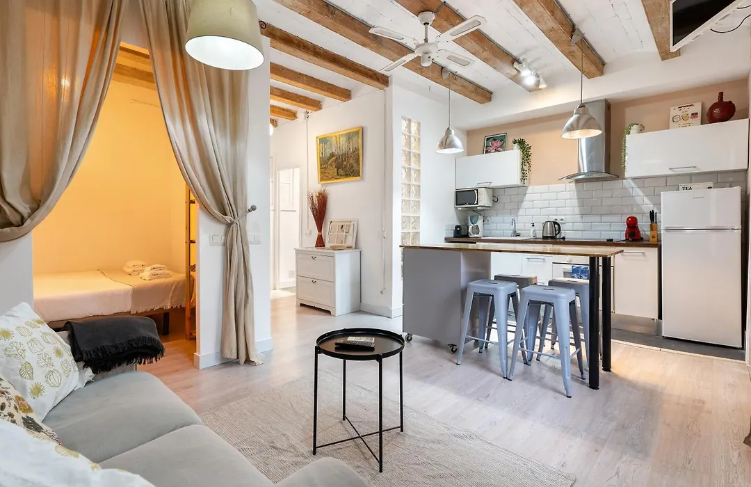 Die 1-Zimmer-Ferienwohnung Sunny Retro Flat Balcony In Poble Sec Barcelona befindet sich im Stadtviertel Sant Antoni von Barcelona, 5 Minuten Fußweg von der Fira de Barcelona entfernt.